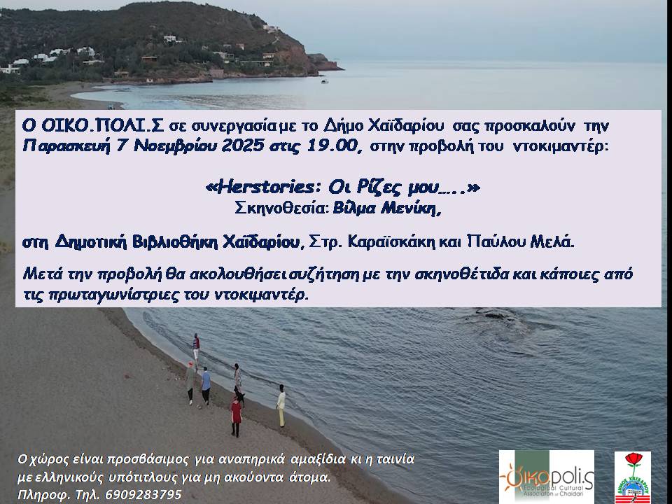 Ο ΟΙΚΟ.ΠΟΛΙ.Σ σε συνεργασία με το Δήμο Χαϊδαρίου σας προσκαλούν την Παρασκευή 7 Νοεμβρίου 2025, στις 19:00 στη Δημοτική Βιβλιοθήκη Χαϊδαρίου , Στρ. Καραϊσκάκη και Παύλου Μελά, Χαϊδάρι στην προβολή του ντοκιμαντέρ «Herstories: Οι Ρίζες μου…..», Σκηνοθεσία: Βίλμα Μενίκη